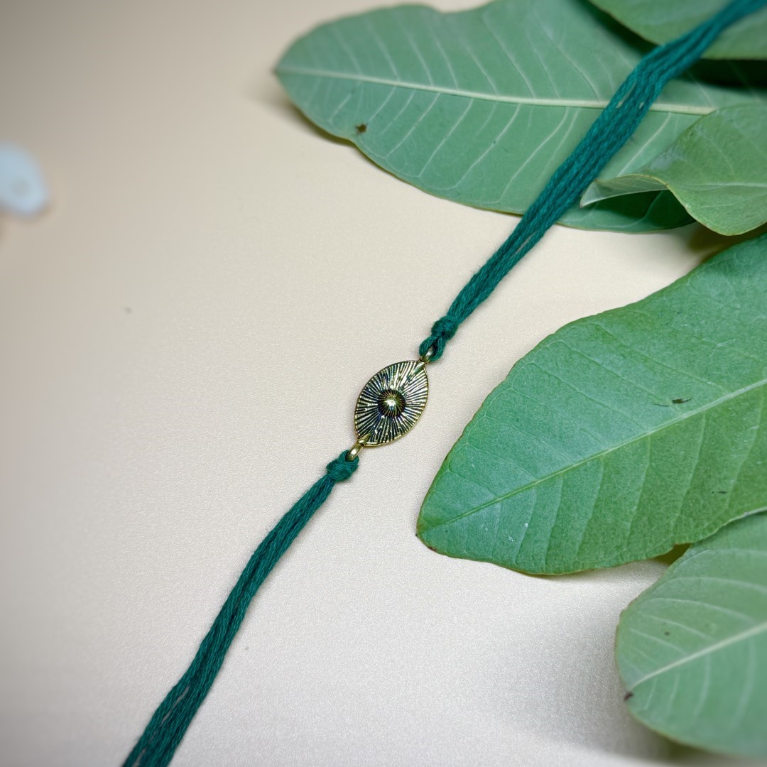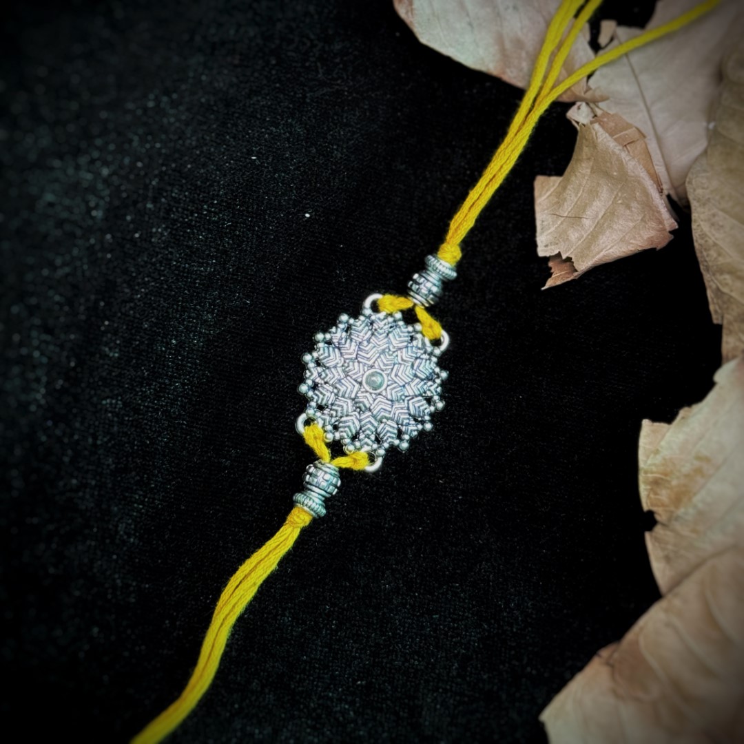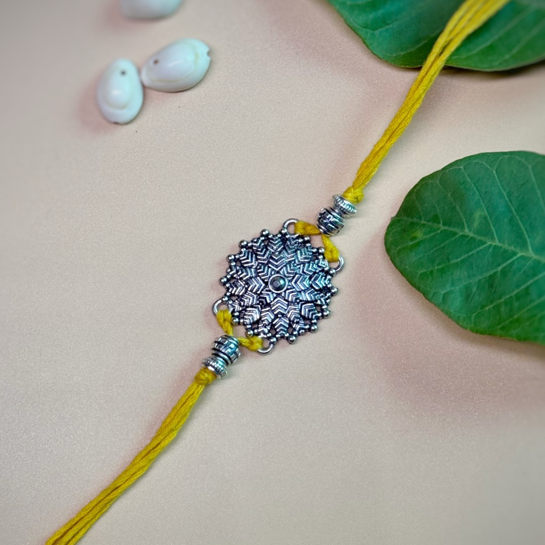 Yellow Thread Floral Rakhi - Oxidized Silver Design