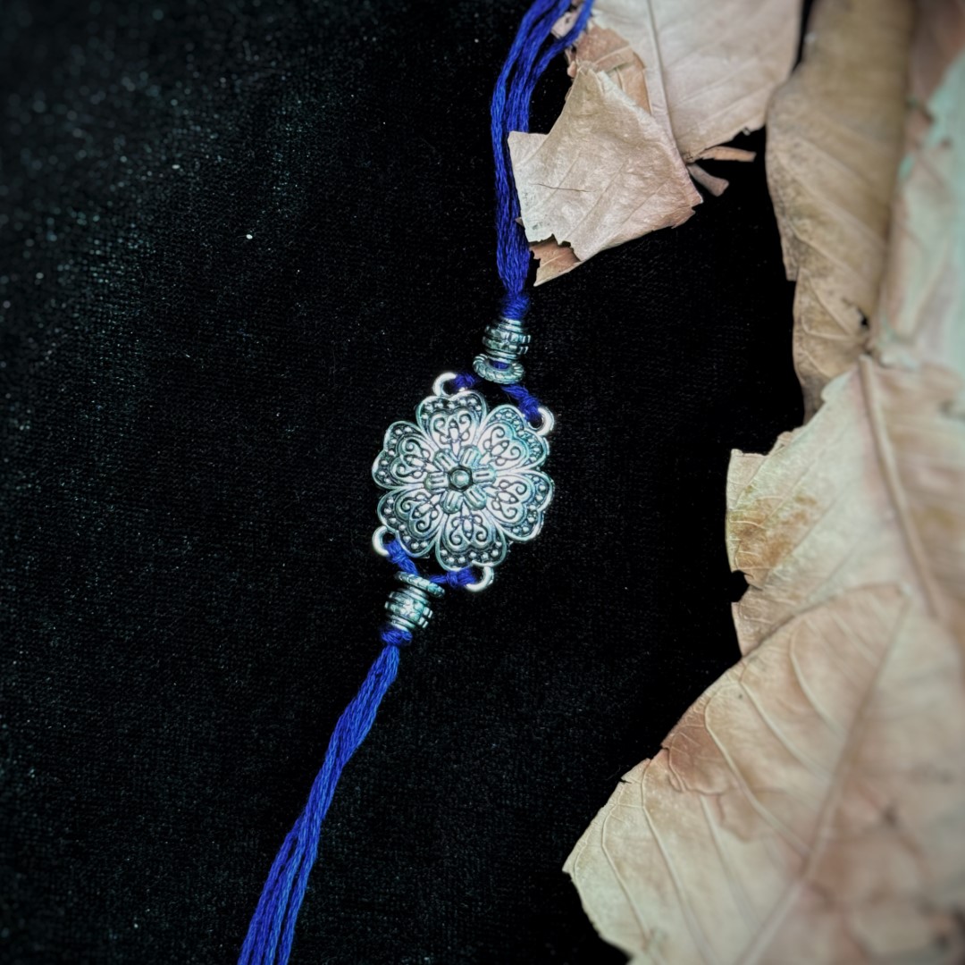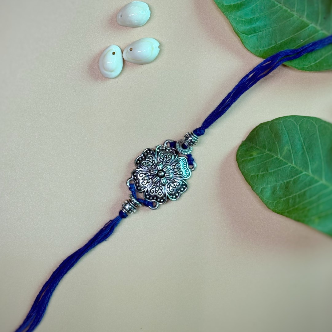 Blue Thread Floral Rakhi - Oxidized Silver Design