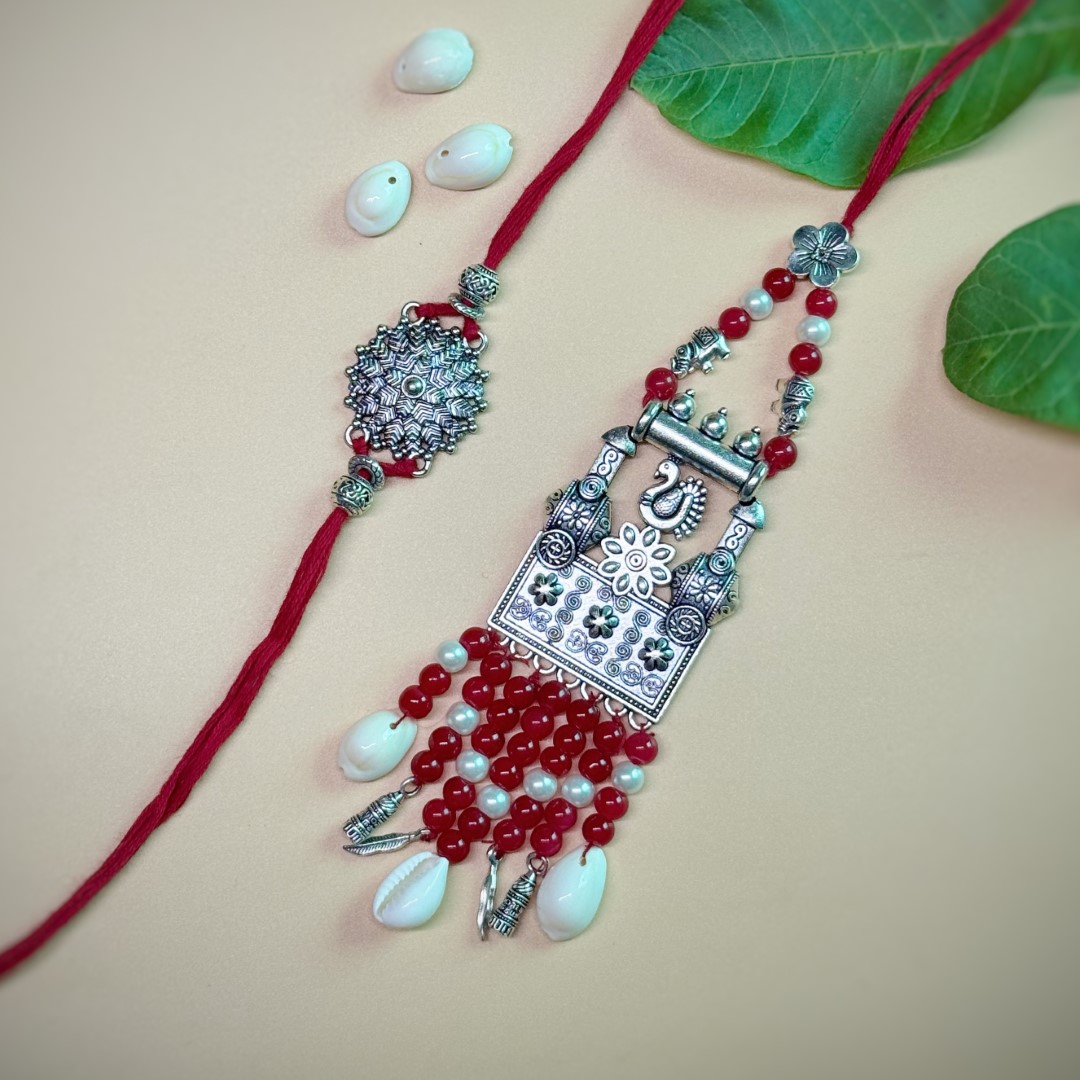 Red Cowrie Pearl Lumba Set - Traditional Rakhi Pair