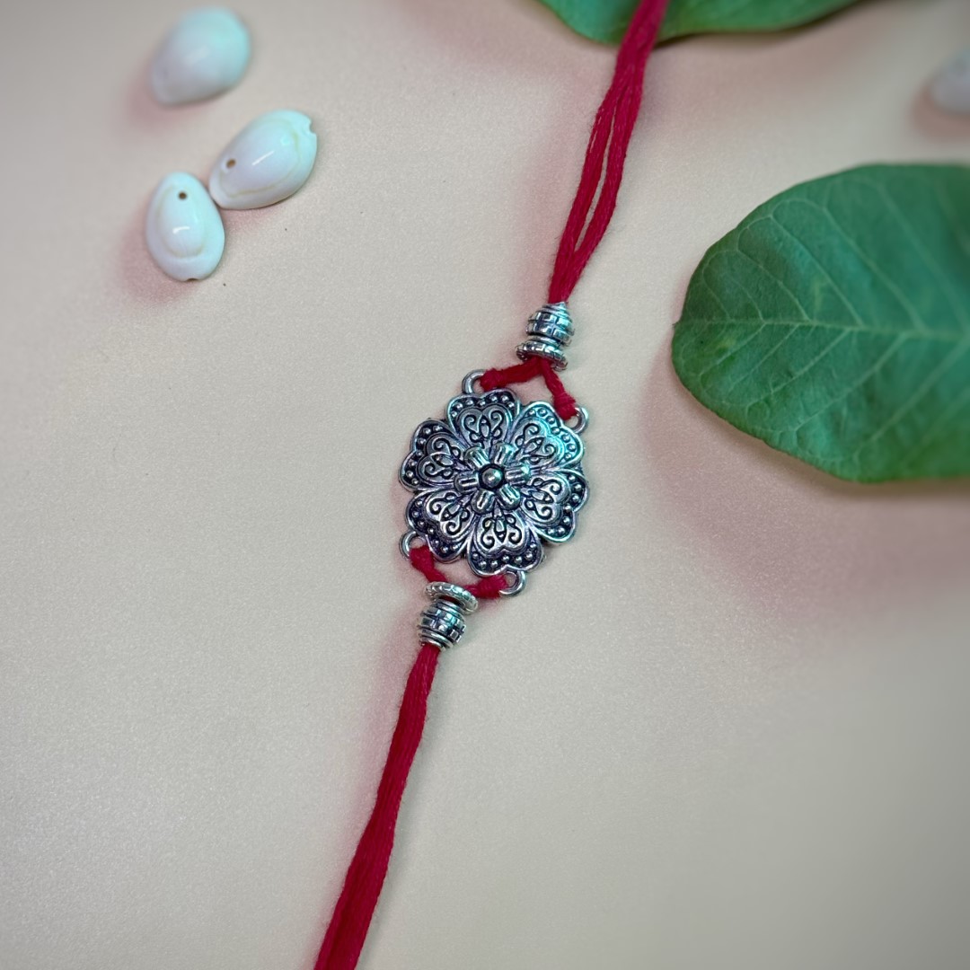 Red Thread Floral Rakhi - Oxidized Silver Design