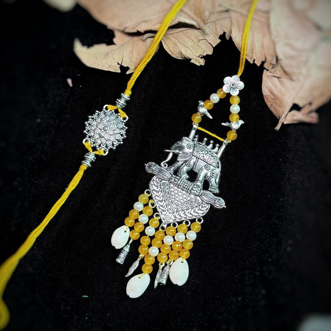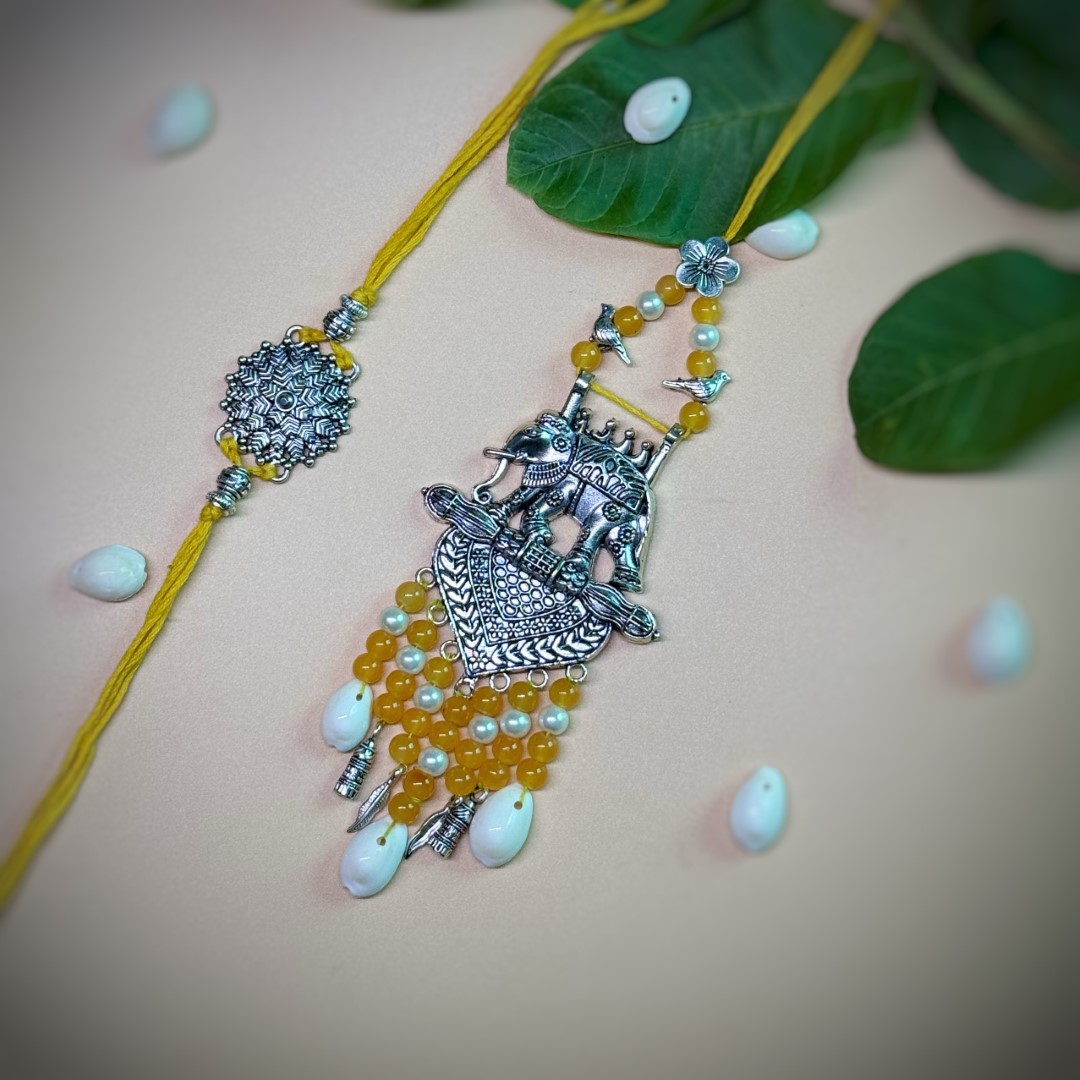 Oxidized Elephant Rakhi Design with Yellow Beads