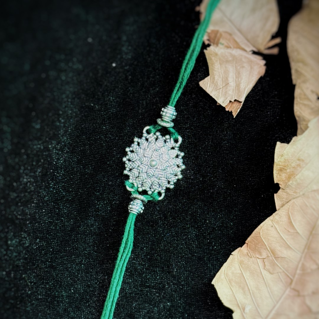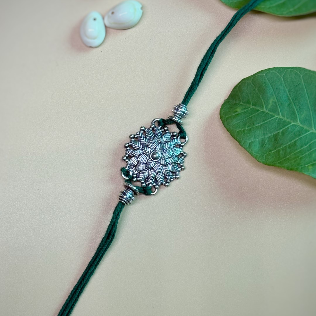 Green Thread Floral Rakhi - Oxidized Silver Design